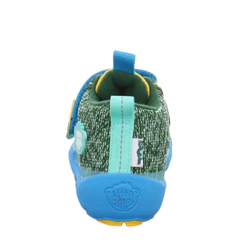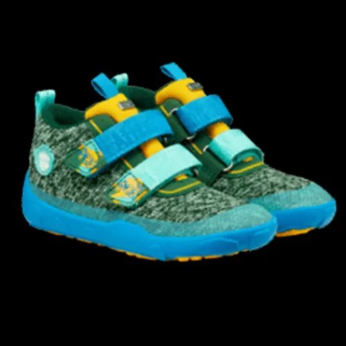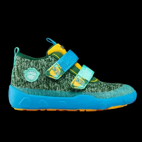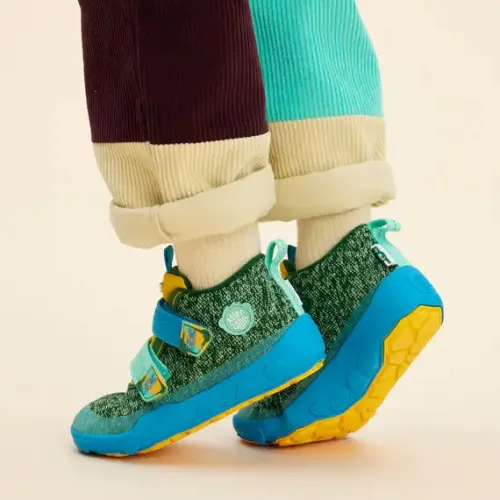 Dejlig Low Boot Knit Happy Creative Bear sko med en overdel af strikket tekstil af bluesign®-certificeret polyester, foret med genanvendt polyester. Lukkes med to velcroremme over vristen, og trækfane på hæl og pløs gør det nemt at træde i skoen, som har en høj ankel. Åbningen og pløsen er polstrede for øget komfort og støtte, og skoen er udstyret med en åndbar og vandtæt AffenTex-membran, så fødderne holdes behageligt tørre. Indersålen er lavet af syntetisk skum og plantebaseret BLOOM™ skum, som er verdens første algebaserede EVA-skum til sko. Skoen er en Barefoot-model med en så tynd som muligt ydersål, så barnet kan mærke og opfatte underlaget. Ydersålen består af 70 % syntetisk gummi og 30 % naturligt gummi og er stødabsorberende med et godt vejgreb. Skoen er 100 % vegansk.