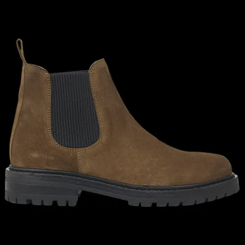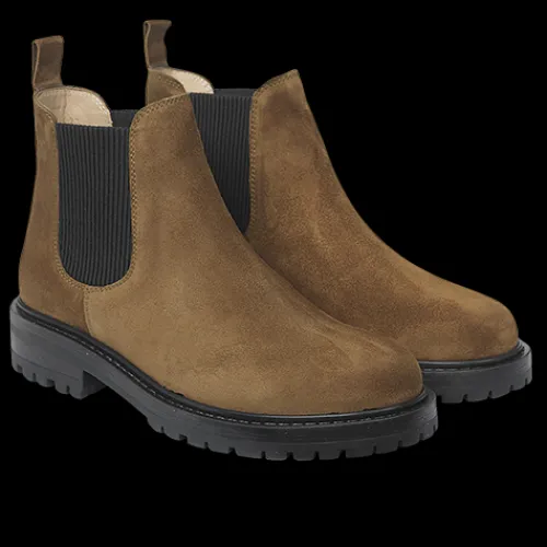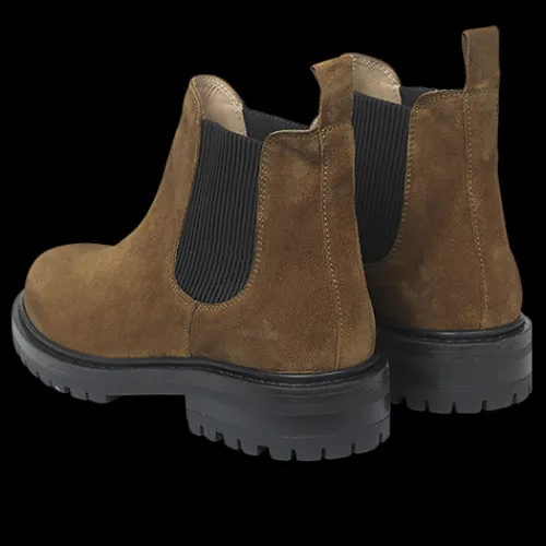 Flot Chelsea-støvle i brunt ruskind og med de klassiske elastikpaneler på siderne. Støvlen har en trækfane bagpå, der gør det nemt at komme i støvlen. Indersålen er komfortabel, og den grove gummiydersål er stødabsorberende og giver et godt fodfæste.