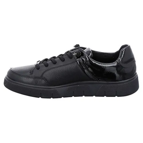 Super fin Ara sneaker i dejlig blødt skind med lakdetaljer. Skoen har elastiksnørebånd, så de er nemme at tage på. Det indvendige frottéfoer er hurtigtørrende, fugtabsorberende, og dejlig blød. Desuden understøtter kombinationen af blødt materiale, en yderst fleksibel ydersål og en polstret indersål (“High Soft”) dit velbefindende ved hvert trin. Dæksålen er aftagelig og kan erstattes med ens egen ved behov.