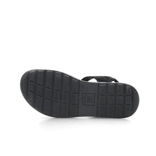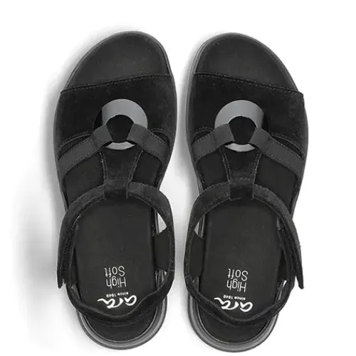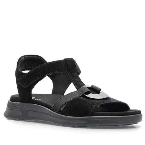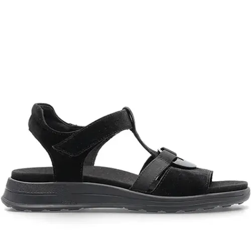 Dejlig sandal med en overdel af ruskind dekoreret med en plastring fastholdt med tekstilrem. Sandalen lukkes med en velcrorem om anklen, og hælremmen er let polstret for øget komfort. Med vidde H er der ekstra plads om forfoden, og den diskrete hælhøjde giver et feminint touch. High Soft-dæksålen er komfortabel og kan desuden tages ud. Den fleksible gummiydersål er stødabsorberende med et fint vejgreb.