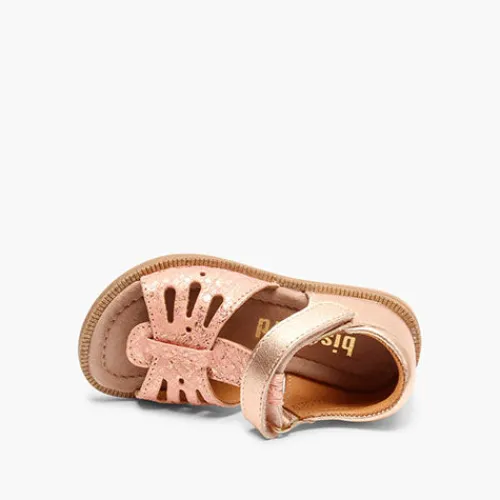 Åben sandal fra Bisgaard i flot rosa gold farve, der giver tæerne luft. Sandalen er produceret i naturligt og åndbart læder og har en blød og fleksibel sål. Sandalen har en velcro lukning over foden, der gør den let at tage af og på.