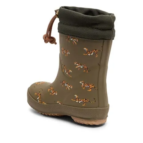 Lækker Safari termostøvle med en vandtæt overdel af naturgummi dekoreret med søde små tigre, og med et lunt, blødt lammeuldsfoer holdes fødderne både varme og tørre. Åbningen er kantet med en bred løbegang og har ruskindssnøre med metalstopper. Støvlen har en normal/bred pasform. Den udtagelige indersål er beklædt med varmt uldfoer, og den fleksible gummiydersål er stødabsorberende med et fint fodfæste. Termostøvlen er en pålidelig ven på kolde og våde regnvejrsdage og føles som en drøm for små fødder.