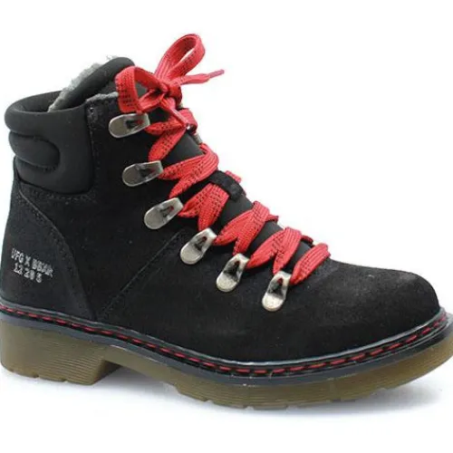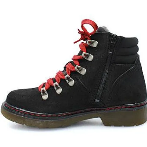 Snørestøvle fra Bullboxer med røde snørebånd. Indvendig på skaftet et der lynlås. Støvlen er foret med et lunt tekstilfoer.