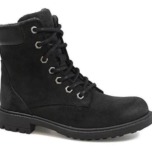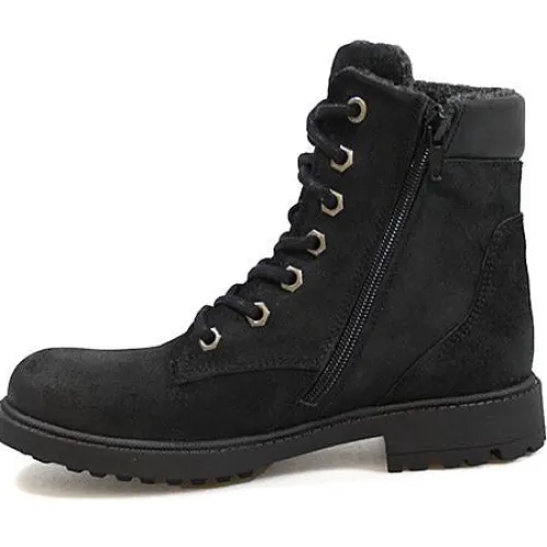 Snørestøvle fra Bullboxer i sort skind. Indvendig på skaftet et der lynlås. Støvlen er foret med et lunt tekstilfor.