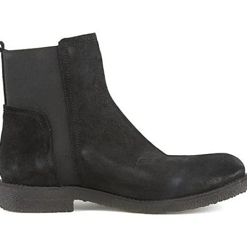 Rå ankelstøvle med en overdel af ruskind samt elastik i siden og bag på skaftet. Den fleksible rågummiydersål er blød og stødabsorberende med et fint fodfæste.