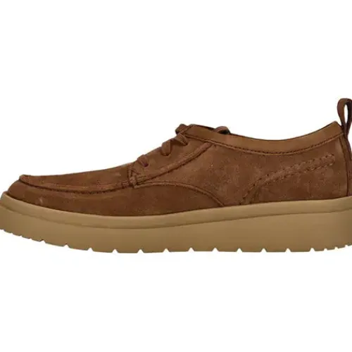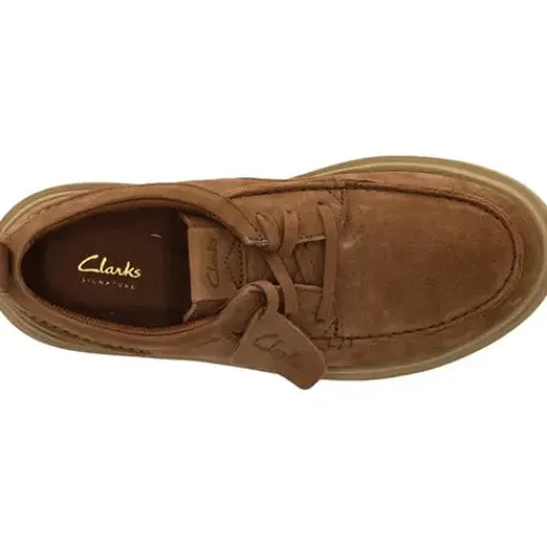 Lækker Polden Moc sko med en overdel af ruskind med moc toe-syning på forfoden. Skoen lukkes med snørebånd, som har et af de ikoniske Clarks-skindmærker trukket på. Åbningen er polstret for øget komfort, og en trækfane på hælen gør det nemt at træde i skoen. Vidde G er Clarks’ standardvidde til mænd. Den udtagelige Contour Cushion-indersål er polstret og komfortabel, og den fleksible ydersål er stødabsorberende med et godt fodfæste.