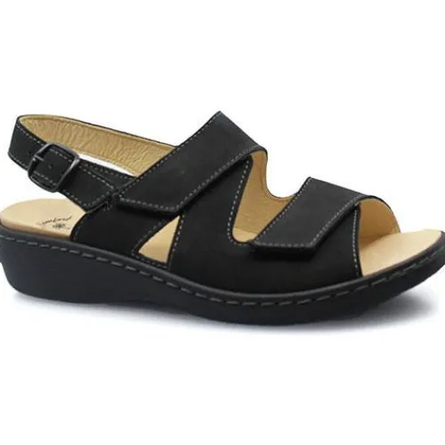 Komfortabel sandal med kilehæl fra det tyske mærke Doc Comfort. Sandalen har løse indlægssåler i skind, velcro over foden og rem bagom hælen, der lukkes med spænde.