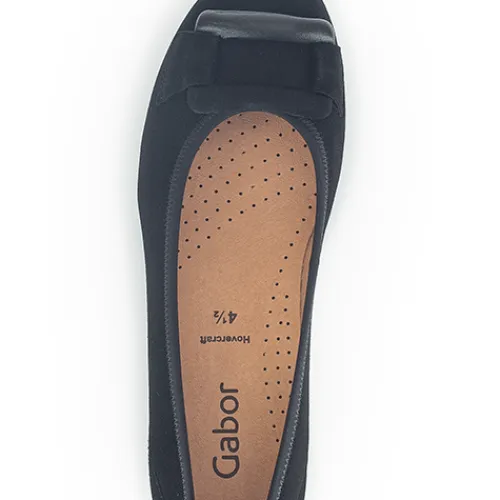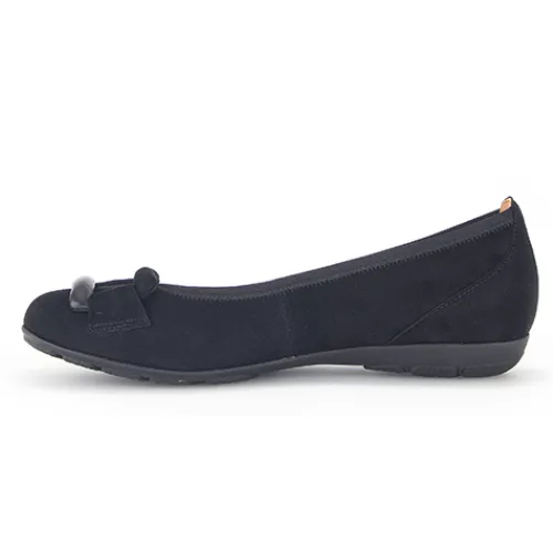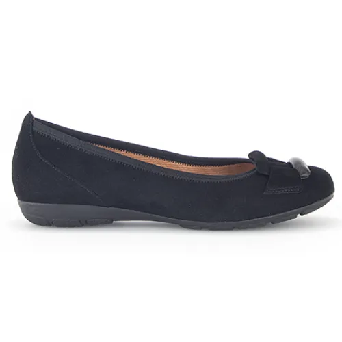 Flot ballerinasko med pynt på forfoden. Overdelen er af ruskind foret med tekstil, og den åndbare indersål er beklædt med skind. Den fleksible og stødabsorberende gummiydersål har et godt mønster og giver et godt fodfæste, og med Gabors Hovercraft luftkammersåler med dæmpende skum får du mere komfort og støtte til foden. Fås i halve størrelser.