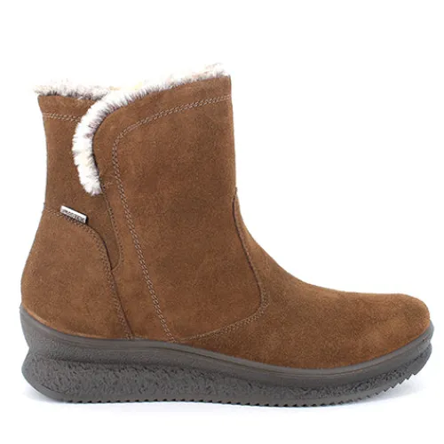 Let og lækker støvle med en overdel af ruskind. Støvlen lukkes med en lynlås på indersiden af anklen. Indvendig har støvlen et lunt fleecefoer, og åbningen er kantet med blødt faux pels, imens en åndbar og vandtæt ImacTEX-membran holder fødderne tørre. Støvlen er lavet på en anatomisk læst med svangstøtte og har ekstra vidde om forfoden. Indersålen kan tages ud, og den fleksible ydersål er stødabsorberende med et fint fodfæste.