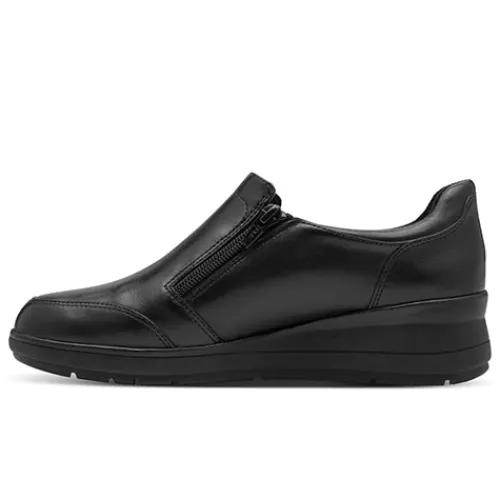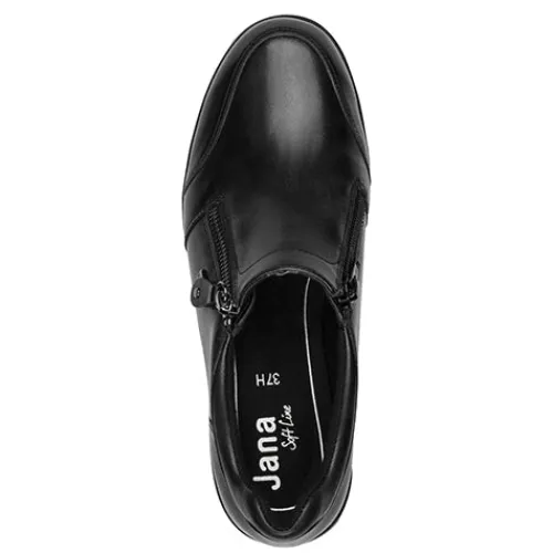 Vandtæt sko med kilehæl og ekstra vidde. Overdelen er af glat skind, og skoen lukkes med to lynlåse på hver side af vristen. Åbningen er polstret for øget komfort, og med vidde H er der plads til den bredere fod. En Jana tex-membran gør skoen vandtæt, Soft Line-indersålen er blød og komfortabel, og ydersålen med den feminine kilehæl er stødabsorberende med et godt fodfæste.