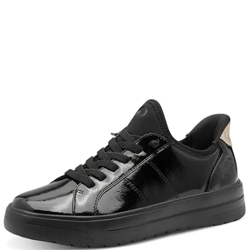 Flot sko med en overdel af lakeret syntet, tekstil og guldfarvet syntet på hælen. Skoen er en Step-in-model, så du kan træde i den uden at bukke dig eller bruge hænderne. En elastiksnøre på forfoden sørger for, at skoen tilpasser sig foden i løbet af dagen, og med vidde H er der plads til den bredere fod. Den udtagelige indersål er blød, polstret, komfortabel og støddæmpende, og den superlette ydersål er stødabsorberende. 100 % vegansk.