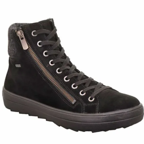 Skøn Mira ankelstøvle med en overdel af ruskind og en bred, polstret tekstilkant over hælen. Støvlen justeres med snørebånd og lukkes med en lynlås på ydersiden langs med snørebåndet. Indvendig om foden har støvlen et varmt foer samt en åndbar og vandtæt GORE-TEX®-membran, så fødderne holdes varme og tørre. Indersålen kan tages ud, og den fleksible ydersål er stødabsorberende med et godt fodfæste. Fås i halve størrelser.