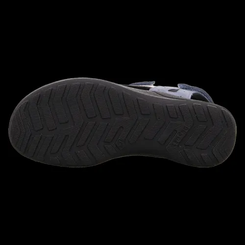 Lækker Siris sandal med en overdel af nubuck på et blødt tekstilfoer. Sandalen lukkes med tre velcroremme (forfod, vrist og hæl) for optimal tilpasning til foden. Den komfortable dæksål er beklædt med tekstil, og den meget fleksible ydersål er stødabsorberende med et fint fodfæste.