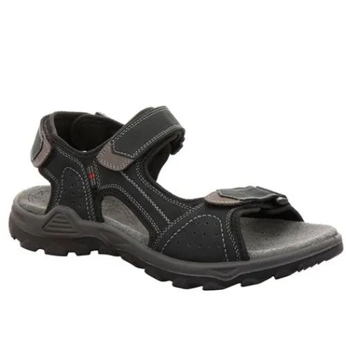 Lækker sandal med en overdel af nubuck foret med tekstil. Lukkes med tre velcroremme (forfod, vrist og hæl) for optimal tilpasning til foden. Den skindbeklædte dæksål er åndbar, anatomisk og komfortabel, og den fleksible ydersål er stødabsorberende og giver et godt fodfæste.