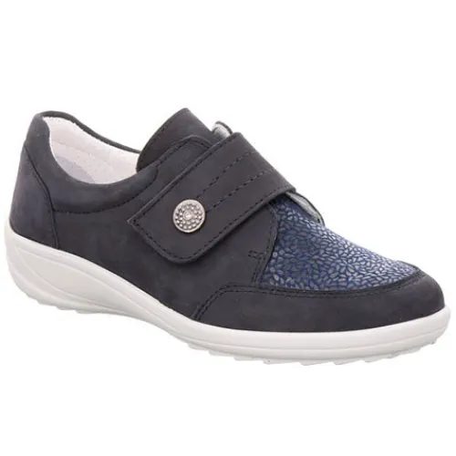 Dejlig sko med en overdel af nubuck og tekstil med effekt. Skoen lukkes med en bred velcrorem over vristen, dekoreret med en metalknap med en glitrende sten. Skoen kan åbnes meget op, derfor er det nemt at træde i den. Den komfortable indersål kan tages ud, og ydersålen er fleksibel og stødabsorberende med et fint fodfæste.