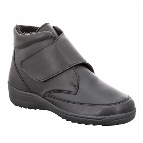 Lækker ankelstøvle med en overdel af blødt, glat skind. Støvlen lukkes med en bred velcrorem over vristen, og åbningen er polstret for øget komfort. Indvendig har støvlen et blødt, let og lunt foer, og indersålen kan tages ud. Den fleksible gummiydersål er stødabsorberende med et godt fodfæste.