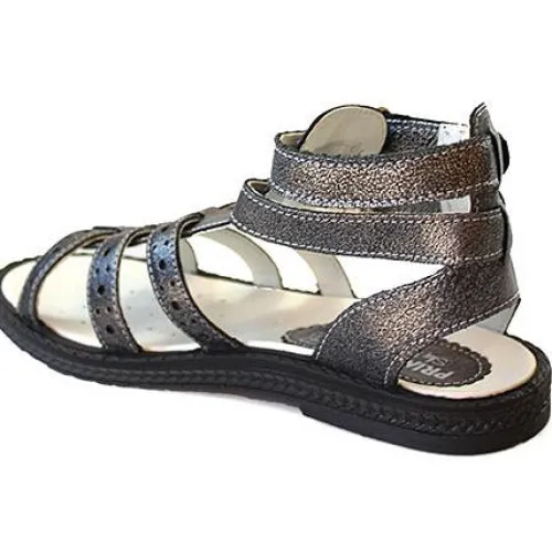 Super lækker gladiator sandal i metalisk skind. Velcro på de to øverste remme, gør dem lette at få af og på. Bløde og fleksible såler.