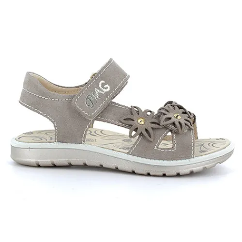 Super og let sød Primigi sandal med fint blomsterpynt. Velcro over tæer og vrist. Bløde og fleksible såler med stødabsorbering. Dæksål i skind.