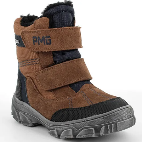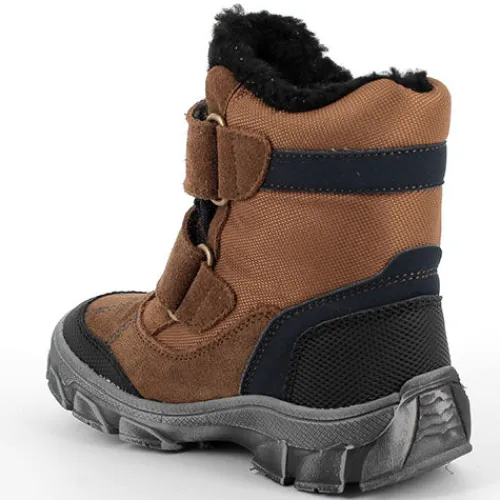 Smart brun støvle fra Primigi med mørkeblå detaljer. Støvlen fremstår 100% vind- og vandtæt og har et loddent foer. Støvlen reguleres med to velcrobånd over foden.