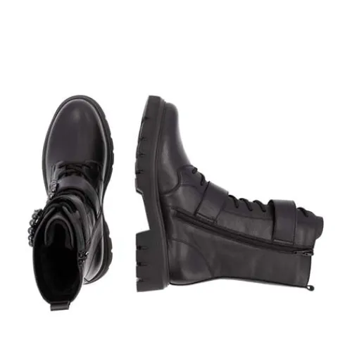 Let og smart støvle med en overdel af glat skind og syntet. Støvlen justeres med snørebånd og to velcroremme med runde pyntespænder af mørkt metal, og den lukkes med en lynlås på indersiden af anklen. En lille trækfane bagpå gør det nemt at træde i støvlen, som har et blødt fleecefoer. Med komfortvidde er der mere plads om forfoden. Indersålen er komfortabel, og den kraftige ydersål er stødabsorberende med et fint fodfæste.