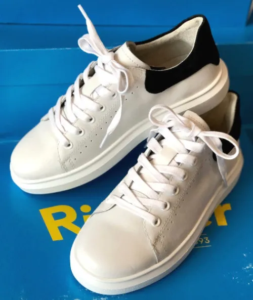 Hvid lædersko fra Richter med snørebånd og sort skinddetalje på hælkappe.