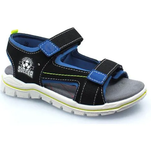 Drenge sandal fra Ricosta med blink og fodbold-illustration. To velcroremme der hurtigt justeres. Sålen er let og stødabsorberende.