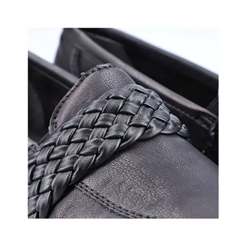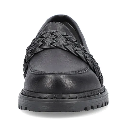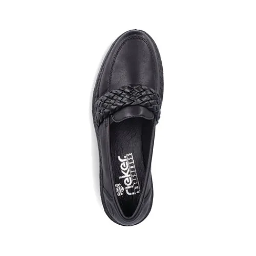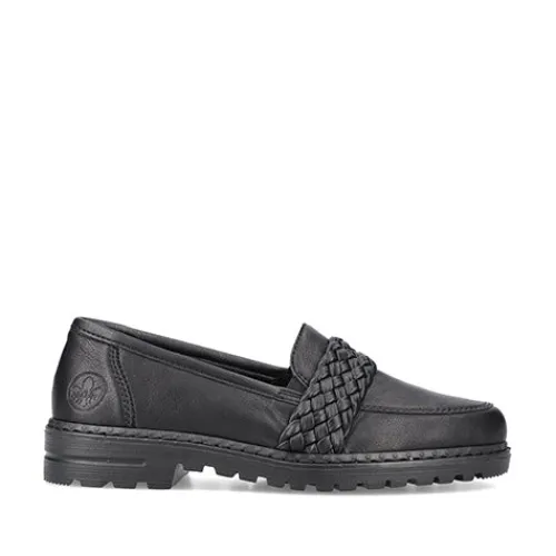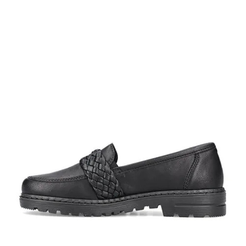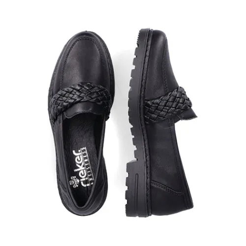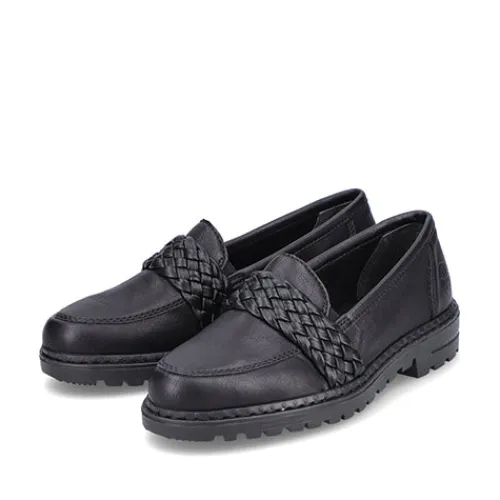 Pæn loafer fra Rieker med flettet rem over vristen. Lidt grove såler under bunden.