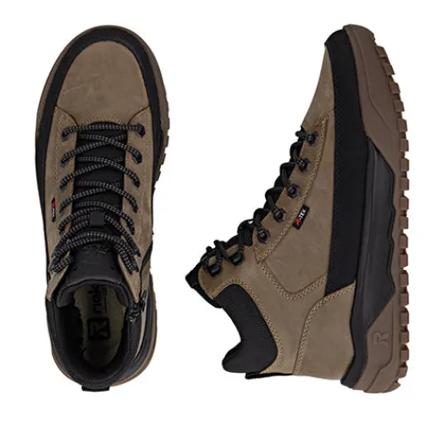 Kraftigt vandafvisende vinterstøvle med Rieker-TEX og en overdel af tekstil og syntet. Støvlen justeres med snørebånd og lukkes med en lynlås på indersiden af anklen, åbningen er godt polstret, og en trækfane på hælen gør det nemt at træde i støvlen. Med vidde G er der mere plads om forfoden. Indvendig har støvlen et varmt foer, og sammen med Rieker-TEX-membranen holdes fødderne varme og tørre. Den udtagelige indersål har Thermo-Foil og beskytter dermed ekstra mod kulde nedefra. Indersålen er desuden polstret og komfortabel, og den kraftigt mønstrede gummiydersål er stødabsorberende med et godt vejgreb.