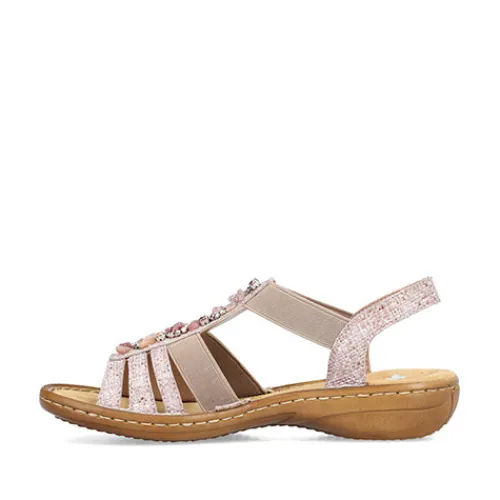 Sød slip on-sandal med både elastiske og faste remme over forfoden og vristen samt en fast rem om hælen. Sandalen er fint pyntet med sten og perler på vristen. Den bløde Antistress-indersål giver god komfort, og den fleksible ydersål giver stor bevægelighed.