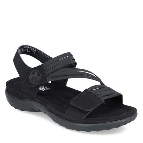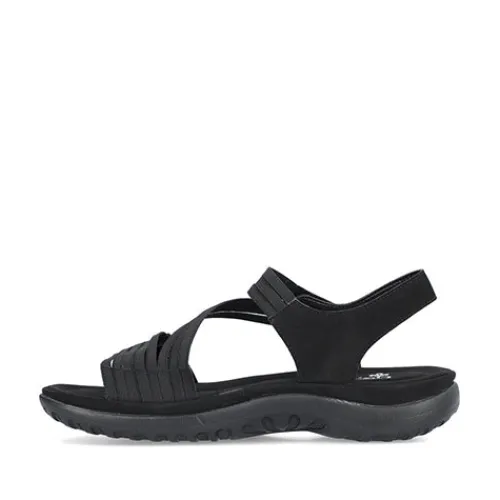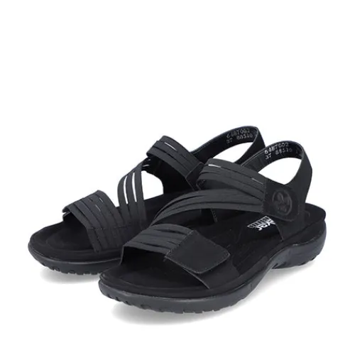 Dejlig let og blød sandal fra Rieker med fine detaljer og en stødabsorberende bund. Sandalen har 2 velcrolukninger (forfod og vrist), som gør det nemt at komme i den. Remmene er elastikbånd, hvilket gør sandalen meget fleksibel og komfortabel. EVA-ydersålerne gør sandalerne lette og fleksible, så du oplever velvære, uanset hvor længe du har dem på.