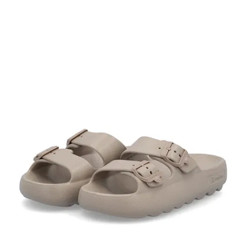 Dejlig slippers-sandal af stødabsorberende, blødt PU-skum. Sandalen er flad med en 3 cm høj plateausål og holdes på plads med to remme over vristen. Remmene kan justeres med spænder. Sandalen er blød, fleksibel og stødabsorberende med et fint fodfæste.