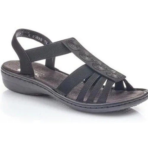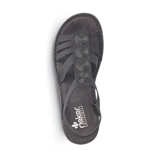 Populær sandal fra Rieker med elastik over vristen og pynt på forfoden. Blød og behagelig dæksål i mikrofiber.