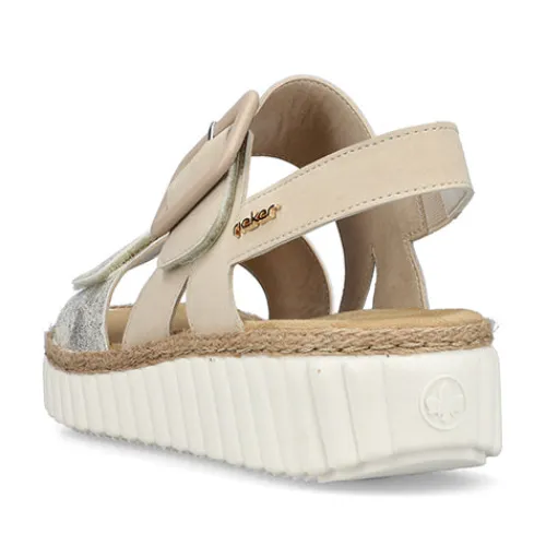 Flot sandal med ekstra vidde og en overdel af syntet i skindlook. Sandalen lukkes med to brede velcroremme over vrist og forfod, og remmen over vristen har et flot pyntespænde, imens remmen over forfoden har metaleffekt. På siden af hælremmen, som har elastik for optimal tilpasning, sidder et guldfarvet Rieker-logo af metal, og rundt om kanten af sandalen udenpå dæksålen sidder et flettet jutebånd. Antistress-indersålen er komfortabel, og den stødabsorberende ydersål med sit karakteristiske design har dybe riller, som giver et godt fodfæste.