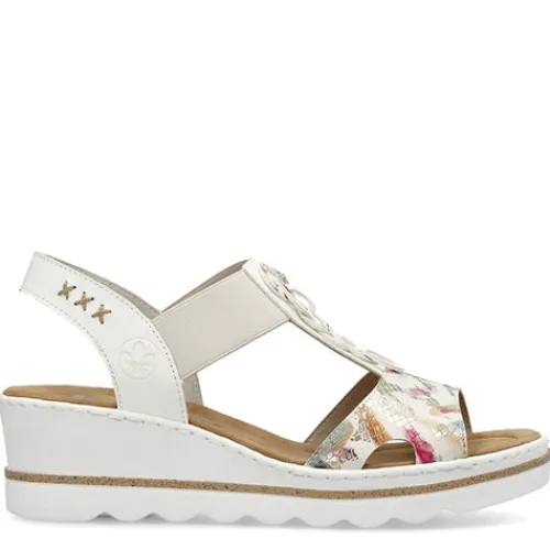 Sommersandal med kilehæl og multifarvede detaljer på vristen. Overdelen er af syntet, dekoreret med udskårne ringe på vristen, og kilehælen giver et feminint look. En elastikrem holder sandalen på plads på foden. Antistress-indersålen giver en fin komfort, og den kraftige ydersål giver et fint fodfæste.