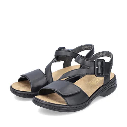 Super fin sandal fra Rieker med pyntespænde. Sandalen har løse indlægssåler og to velcroremme der kan reguleres.