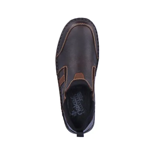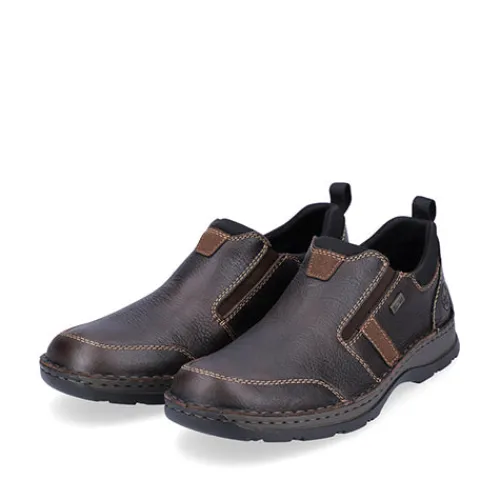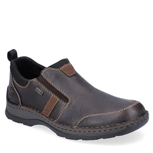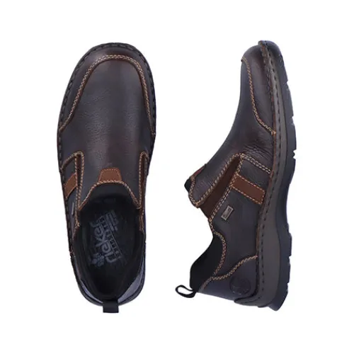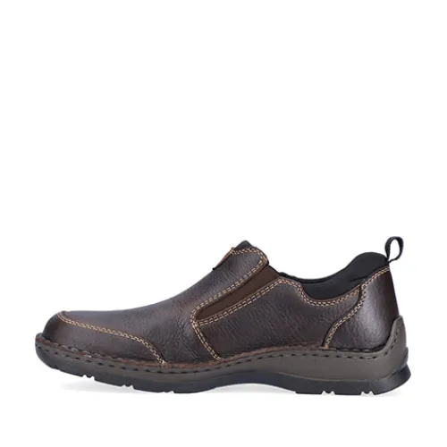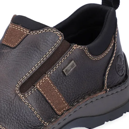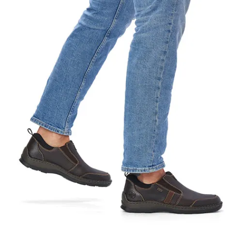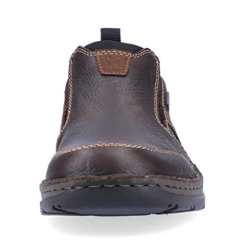 Brun hyttesko med elastik i siderne. Skoen er lavet i skind og har stødabsorbering i sålen. Skoen er i ekstra vidde, så den rummer en bredere fod.
