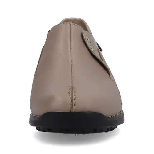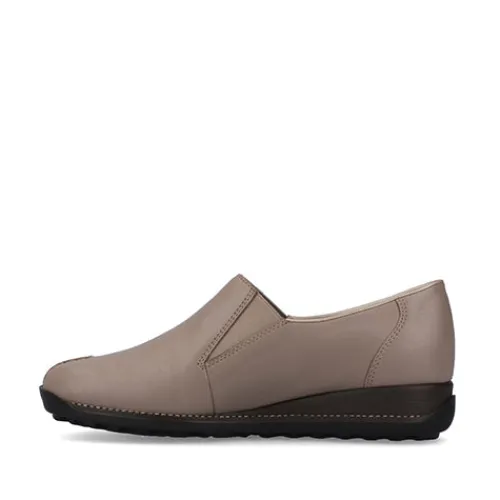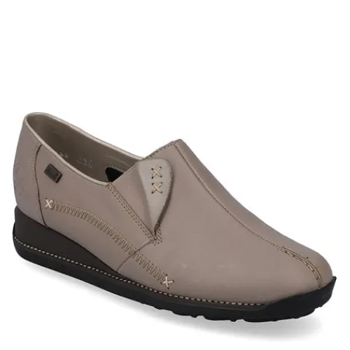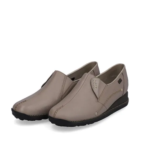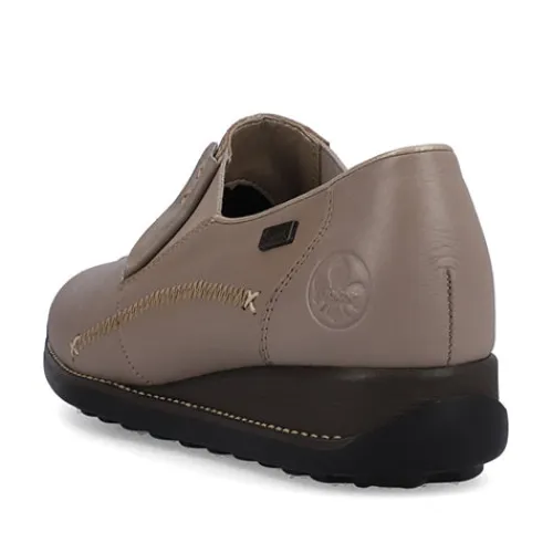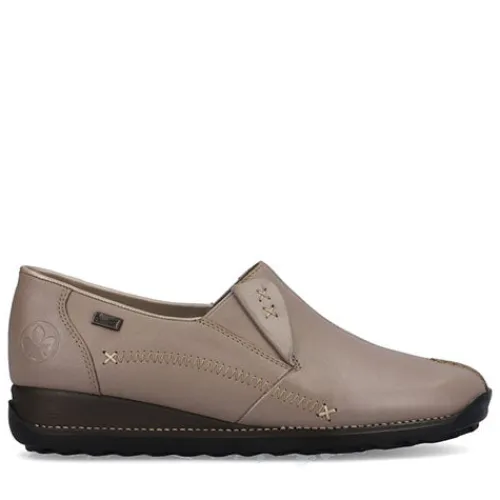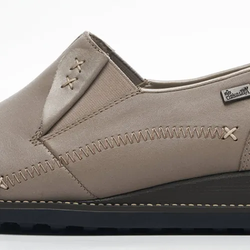 Lækker og blød skindhyttesko med RiekerTex. Elastik ved åbningen og smarte detaljer. Skoen er fleksibel og har en blød indersål af læder.