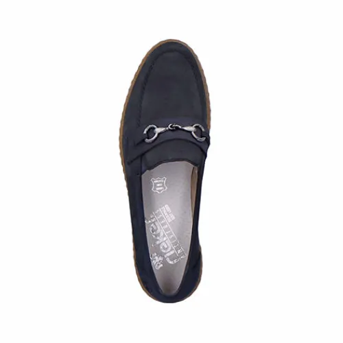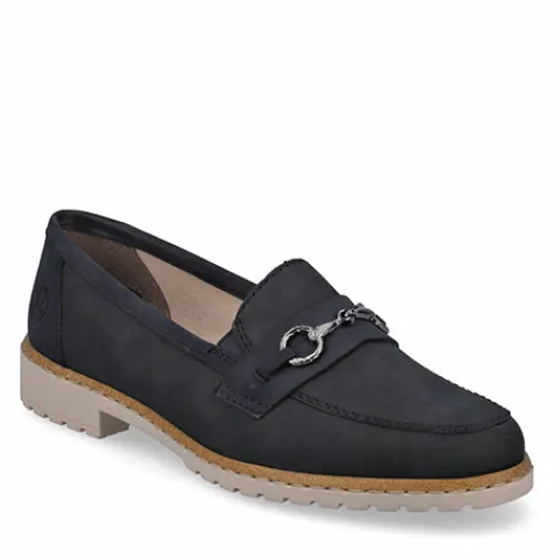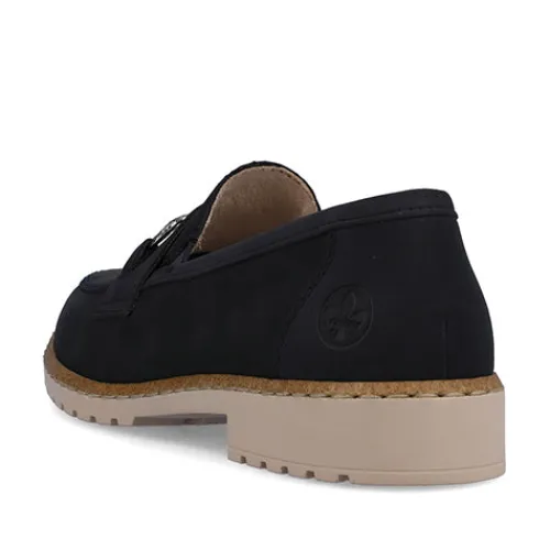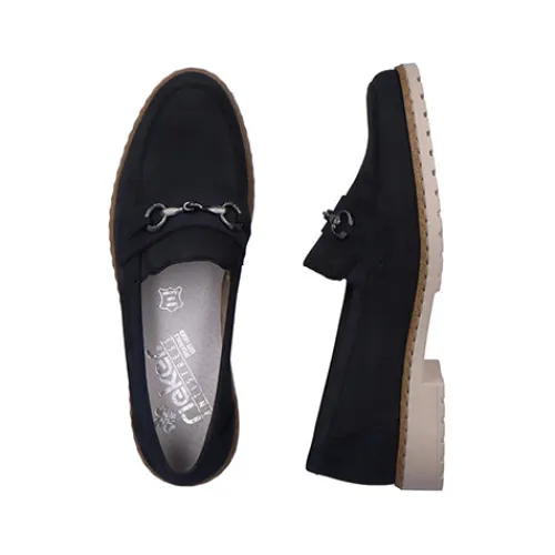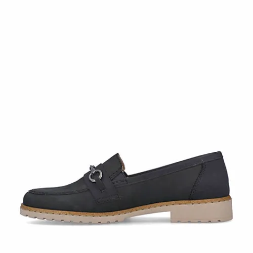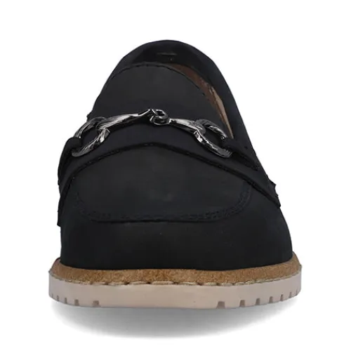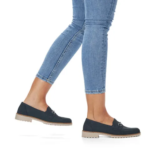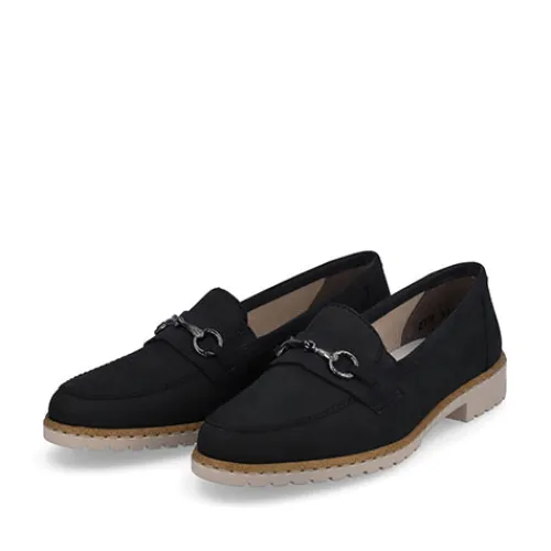 Smarte skindloafers fra Rieker. Skindtypen er nubuck, og skoen har detaljer i syntet samt et smart bidsel henover forfoden. Blød indersål af læder.