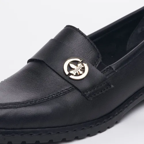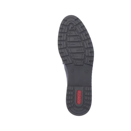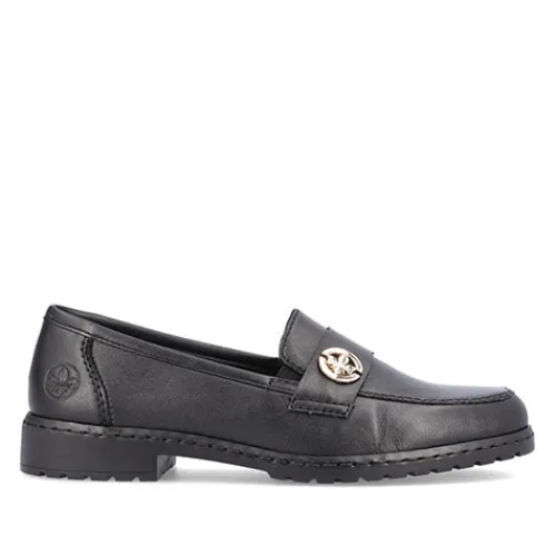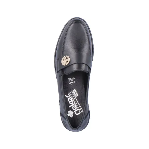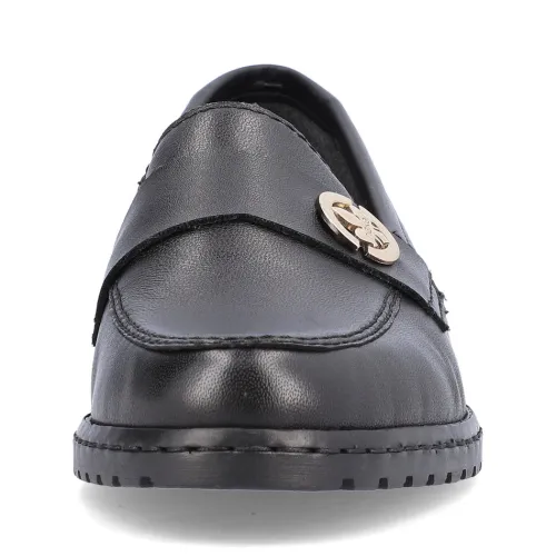 Blød og fleksibel loafer i blødt, glat skind. Skoen har en blød indersål af skind, elastik i begge sider af åbningen samt en flot gulddetalje (Rieker-logo) på remmen over vristen. Her får du et par loafers perfekt til både hverdag og fest.