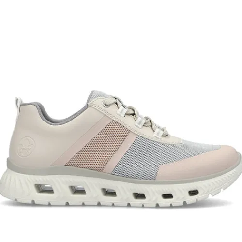 Feminin og meget let Rieker Lite sneaker med en overdel af åndbart tekstil med slidstærke syntetdetaljer på bl.a. snuden, hælen og åbningen. Skoen lukkes med snørebånd, og en trækfane på hælen gør det nemt at træde i skoen. Åbningen er polstret for øget komfort, og Antistress-indersålen er enormt blød og komfortabel. Komforten øges af den ekstra plads omkring forfoden og tæerne. Mellemsålen har tværgående huller, som virker støddæmpende og øger komforten, og ydersålen er fleksibel med et fint vejgreb. Skoen er 100 % vegansk.
