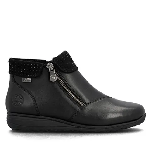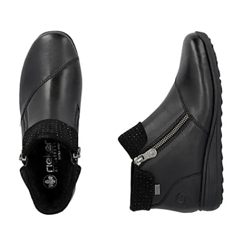 Flot støvlet med varmt foer og Rieker-Tex. Overdelen er af glat skind dekoreret med sorte glitrende similisten på kraven. Indvendig har støvlen et varmt foer, og sammen med en kraftigt vandafvisende Rieker-Tex-membran holdes fødderne varme og tørre. Støvlen lukkes med to lynlåse på siderne. Med vidde H er der plads til den bredere fod. Den udtagelige indersål er polstret, støddæmpende og komfortabel, og den fleksible gummiydersål med en diskret kilehæl er stødabsorberende med et godt fodfæste.