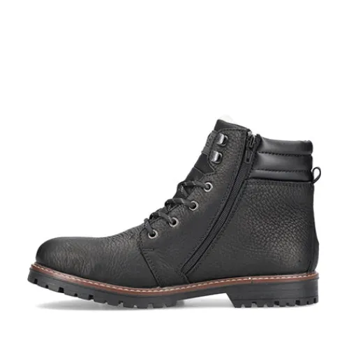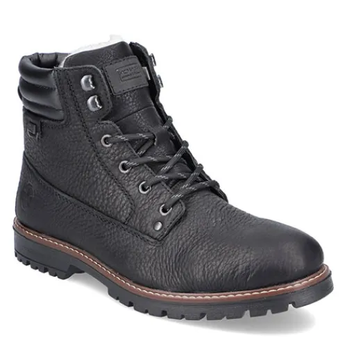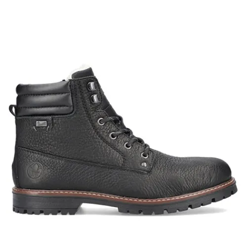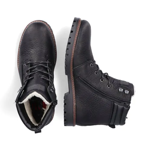 Dejlig vinterstøvle med en overdel af glat læder og detaljer af syntetisk læder. Støvlen justeres med snørebånd og lukkes med en lynlås på indersiden af anklen, og åbningen er polstret for øget komfort. Indvendig har støvlen et varmt uldfoer, og sammen med en vandafvisende RiekerTEX-membran holdes fødderne både varme og tørre. Med komfortvidde er der mere plads om forfoden. Indersålen er komfortabel, og den kraftige ydersål er stødabsorberende med et godt fodfæste.