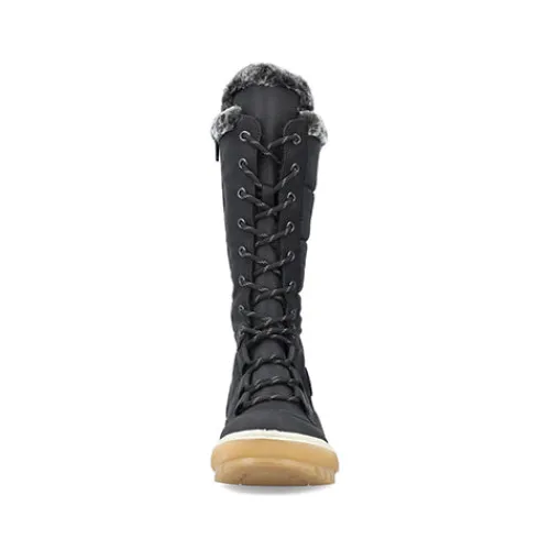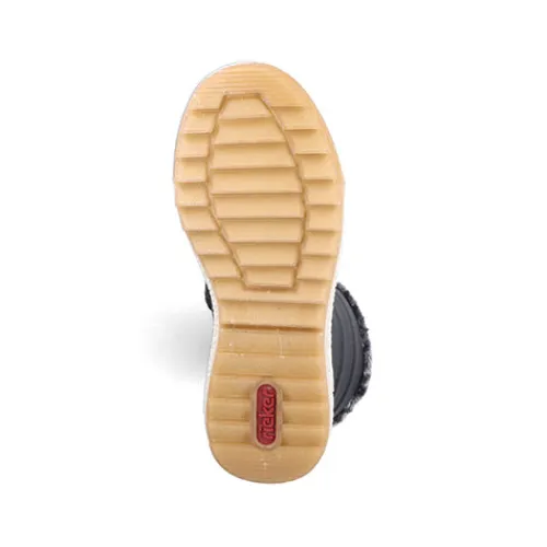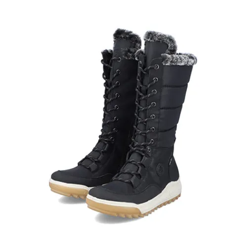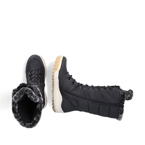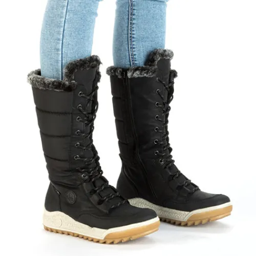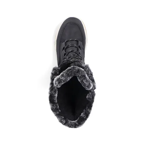 Dejlig vinterstøvle med en overdel af åndbart tekstil og slidstærke syntetdetaljer, dekoreret med en kant af faux pels på kanten af åbningen. Støvlen justeres med snørebånd og lukkes med lynlås på indersiden af det lange skaft. Med den vandafvisende RiekerTEX-membran holdes dine fødder lune og tørre. Indersålen er komfortabel, og den kraftige ydersål giver et godt fodfæste.