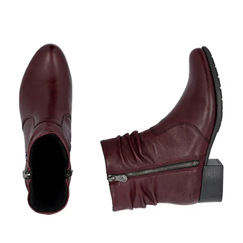 Lækker støvle med en overdel af glat skind, der er rynket om anklen på moderne vis. Støvlen har en lynlås på hver side af anklen, og selvom den på ydersiden godt kan åbnes, så er den mest til pynt. Indvendig har støvlen et let, lunt fleecefoer og en komfortabel indersål. Gummiydersålen er fleksibel, og den ca. 4 cm høje blokhæl giver et feminint look.