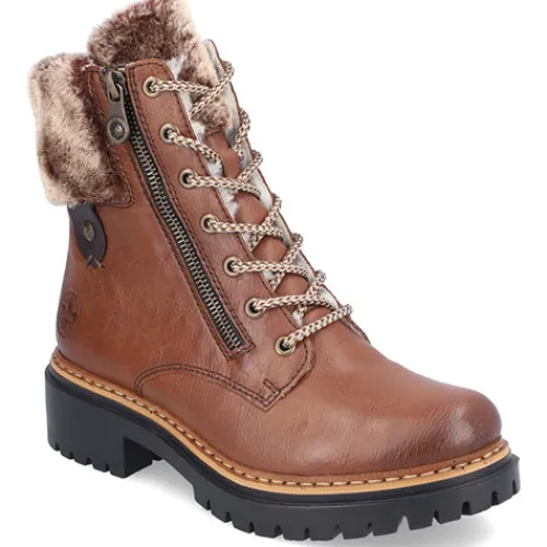 Smart og let Rieker støvle med en overdel af syntetisk skind og faux pels i en bred kant om åbningen. Støvlen justeres med snørebånd og lukkes med to lynlåse. Indvendigt har støvlen et varmt foer af syntetisk uld, og den bløde indersål har en lun belægning. Støvlen er ekstra rummelig om forfoden, og den grove ydersål er fleksibel, stødabsorberende og giver et godt fodfæste.