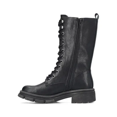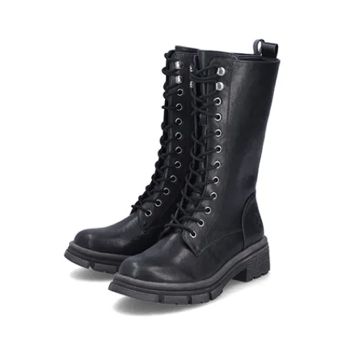 Smart støvle med medium længde skaft. Overdelen er af imiteret glat skind, og støvlen justeres med snørebånd og lukkes med en lynlås på indersiden af benet, imens en trækfane bagpå gør det nemt at træde i støvlen. Indvendig har støvlen et blødt, let fleecefoer. Indersålen er komfortabel, og den kraftige ydersål er stødabsorberende med et godt fodfæste.