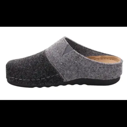 Lækker slippers-hjemmesko med en overdel af filt med metal-“sten” og en lille elastikkile på siden af åbningen. Den ruskindsbeklædte dæksål er polstret, mellemsålen med en diskret kilehæl er stødabsorberende, og den fleksible ydersål giver et fint fodfæste.