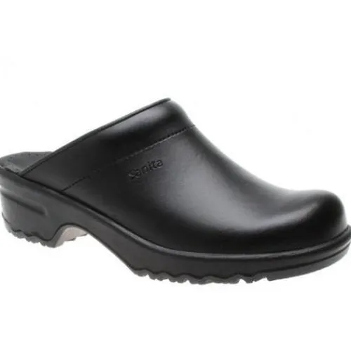 Åben træsko fra Sanita med PU-flexsåler. Overdelen er lavet i skind, og med en kraftig ydersål.