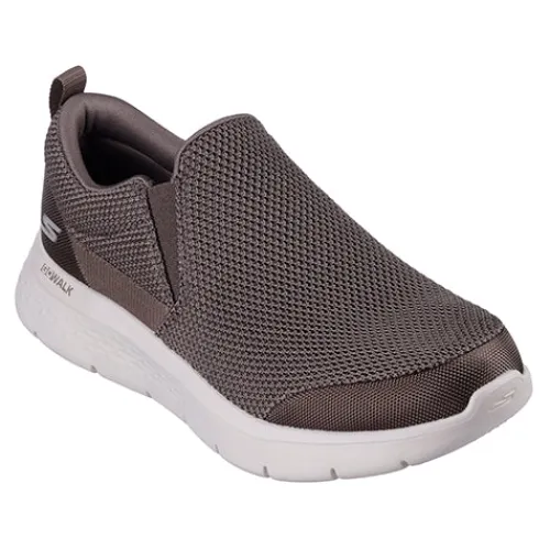 Komfortabel og fleksibel Go Walk Flex Impeccable II sko fra Skechers i en spændende khaki farve. Overdelen er af tekstil, og der er isat en kile af elastik på begge sider ved åbningen, der gør det nemmere at træde i skoen. Det gør trækfanen på hælen også. Åbningen er polstret for øget komfort, og modellen har en Air Cooled Goga Mat indersål, som giver en high-rebound og åndbar stødabsorbering. Letvægtsmellemsålen har responsiv Ultra Go Cushioning, og ydersålen har Flex Pillars-riller i fuld længde på tværs af foden, som øger fleksibiliteten. Kan maskinvaskes ved max 30 grader og skal lufttørres.