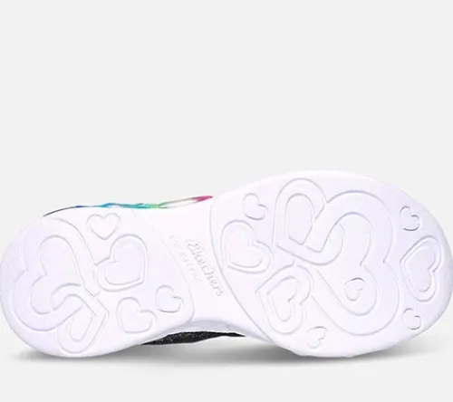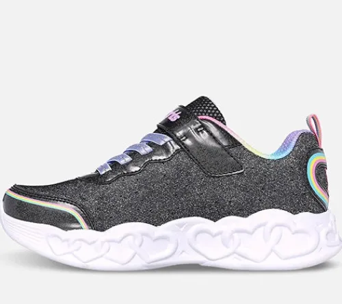 Spændende S Lights Infinite Heart Lights – Love Prism sko med blink på ydersiden af mellemsålen, der er dekoreret med hjerter hele vejen rundt. Overdelen er af tekstil med glitter samt slidstærke syntetdetaljer på bl.a. snuden og hælen, og skoen er dekoreret med farver og hjerter. Skoen lukkes med en velcrorem over vristen, og en flad, ikkejusterbar elastiksnøre sørger for optimal tilpasning til foden. En tænd/sluk-knap til blink sidder på enden af velcroremmen. En trækfane på hælen gør det nemt at træde i skoen. Indersålen er komfortabel, og mellemsålen er stødabsorberende. Den slidstærke, fleksible ydersål er dekoreret med hjerter.